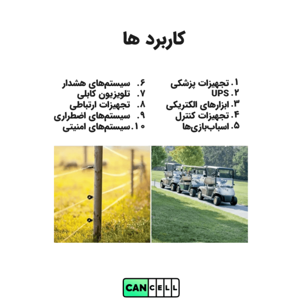 - قابل استفاده در سیستمهای UPS، وسایل نقلیه الکتریکی، دستگاههای خورشیدی و تجهیزات دیگر.