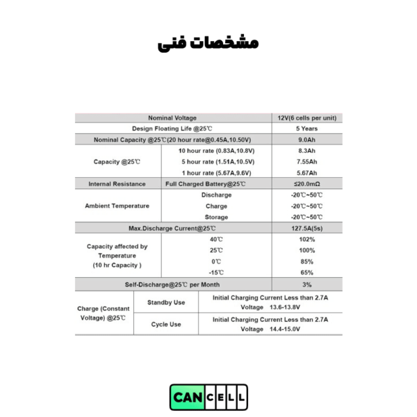 مشخصات کامل باتری UPS برند Cancellbatteryباتری 12 ولت 9 آمپر ساعت، اسید سرب مهر و مومشده (VRLA) – مناسب برای UPS، سیستمهای نظارت تصویری (CCTV)، سیستمهای دزدگیر، دستگاههای پزشکی، وسایل نقلیه برقی – مدل A03-BAT12-9.0A